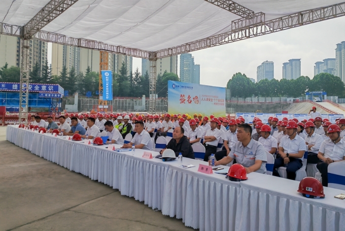 集團(tuán)公司黨委副書(shū)記、總經(jīng)理?xiàng)罱?,副總?jīng)理、總會(huì)計(jì)師嚴(yán)海軍,副總經(jīng)理申小龍出席儀式。集團(tuán)公司總部相關(guān)部門,寶雞片區(qū)各項(xiàng)目部負(fù)責(zé)人、專職安全管理人員及現(xiàn)場(chǎng)施工人員共計(jì)150余人參加了本次活動(dòng),儀式由副總工程師、工程管理部經(jīng)理郭為群主持。